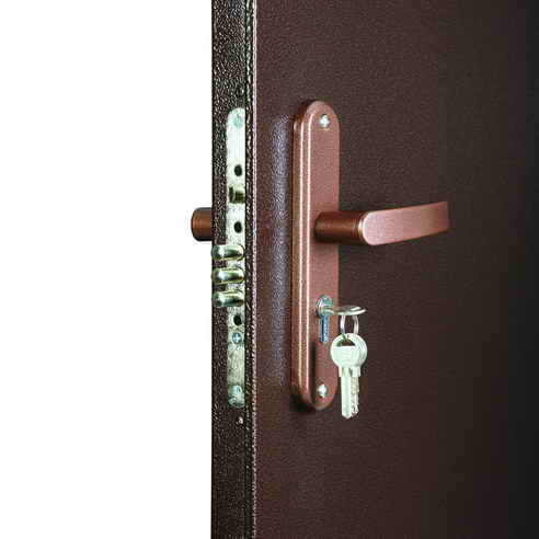 Дверь комплектуется цилиндровым замком Просам 3B4-31/55 второго класса, дверным глазком круглой формы. Дверная ручка установлена на планке совместно с замком и окрашена в медный цвет.